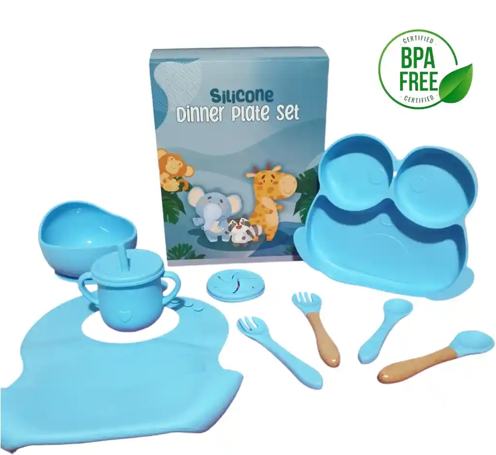 Set de silicona de 8 piezas diseñado para acompañar la etapa de alimentación de bebés y niños pequeños, ofreciendo seguridad, comodidad y practicidad. Elaborado en silicona de grado alimenticio, libre de BPA y ftalatos, es resistente, fácil de limpiar y seguro para el uso diario. Características principales: Incluye plato, bowl, vaso con tapa, cuchara, tenedor, babero, mantel individual y cepillo de limpieza. Silicona suave y flexible que protege encías y dientes. Libre de BPA, ftalatos y sustancias tóxicas. Resistente a altas y bajas temperaturas. Colores atractivos que estimulan el interés del bebé por la comida. Apto para microondas, lavavajillas y congelador (según indicaciones del fabricante). Beneficios de uso: Facilita la transición a la alimentación autónoma. Reduce el riesgo de accidentes gracias a sus bordes redondeados y material antideslizante. Resistente y duradero para uso diario. Ideal para uso en casa o fuera de ella. Especificaciones técnicas: Material: silicona de grado alimenticio. Edad recomendada: desde 6 meses en adelante. Cantidad de piezas: 8 unidades. Contenido del paquete: 1 plato. 1 bowl. 1 vaso con tapa. 1 cuchara. 1 tenedor. 1 babero. 1 mantel individual. 1 cepillo de limpieza. Recomendaciones de uso: Lavar antes del primer uso. Usar siempre bajo la supervisión de un adulto. Evitar cortar alimentos con cuchillos afilados directamente sobre la silicona para prolongar su vida útil.