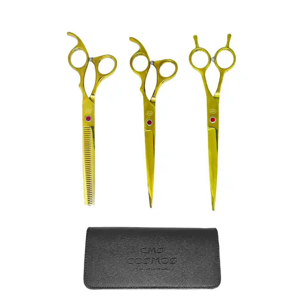 COMPRAS 100% SEGURAS, PRODUCTOS 100% ORIGINALES, SOMOS BET SUPPLIER SAS, SOMOS DISTRIBUIDORES AUTORIZADOS DE CMS COSMOS BELLEZA EN COLOMBIA "Prepárate para alcanzar la excelencia en cada corte de cabello con el extraordinario kit de tijeras por 3, diseñado para uso profesional. Este estuche deslumbrante incluye tres tijeras de alta calidad, cada una hecha en titanio y diseñada para brindarte un rendimiento impecable en tu barbería o salón de belleza. En este kit, encontrarás una tijera lisa con filo de navaja, perfecta para lograr líneas definidas y cortes precisos con un control incomparable. Además, la tijera micro dentada te brindará una capacidad de corte excepcional, ideal para texturizar y dar un acabado impecable a cada peinado. Por último, la tijera entresacadora te permitirá eliminar el exceso de volumen y crear capas suaves y naturales con facilidad. Cada tijera está hecha en titanio, un material reconocido por su resistencia y durabilidad excepcionales. Con estas tijeras en tus manos, podrás confiar en su rendimiento a largo plazo y en la precisión de cada corte. El estuche protector incluido garantiza que tus valiosas herramientas estén siempre seguras y listas para su uso, agregando un toque de elegancia a tu entorno de trabajo. El kit de tijeras por 3 en titanio es la elección definitiva para los profesionales exigentes que buscan resultados impecables y versatilidad en cada peinado. Domina la artesanía del corte de cabello con estas tijeras de calidad superior y eleva tu nivel de habilidad y estilo. No pierdas la oportunidad de destacar en tu profesión con este kit de tijeras de primera clase. ¡Sorprende a tus clientes con cortes de cabello precisos, texturizados y en capas, logrados con el kit de tijeras por 3 en titanio para uso profesional! Tu talento merece herramientas extraordinarias". El color del set de tijeras dependerá de la disponibilidad que haya en stock