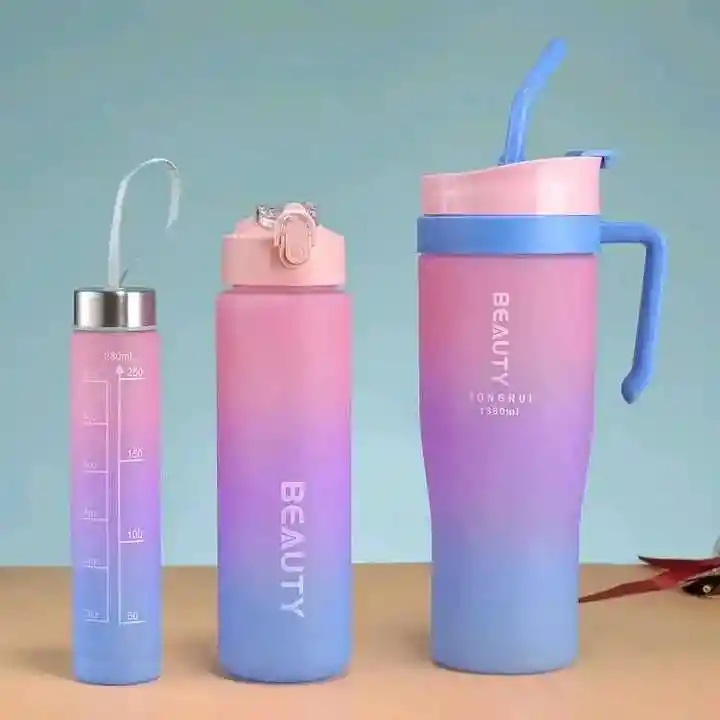 VASO TERMOS X 3 PIEZAS EN DIFERENTES TAMAÑOS Capacidad: 1200 ml 900ml 300ml botella de agua aislada de acero inoxidable con pajita. Versátil: Adecuado para bebidas frías o calientes, manteniendo las bebidas a temperaturas deseadas. Diseño degradado: cuenta con un elegante color degradado con un tono rosa. A prueba de fugas: la tapa atornillada segura evita derrames y fugas durante el viaje. Duradero: hecho de acero inoxidable de alta calidad, sin BPA para un uso duradero.
