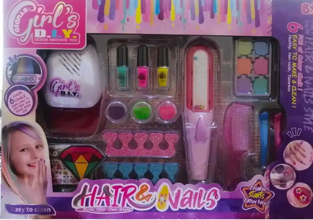 Hermoso y divertido kit para adornar las uñas acompañado de un secador de uñas , deja que tu hija se divierta disfrutando de este espectacular kit, sola, contigo o en pijamada Este increíble gel de uñas está diseñado para alentar y promover la creatividad de las niñas mientras disfrutan de un tiempo de diversión.No es tóxico, muy fácil de manejar y diseñar. te permite expresar tu creatividad en el arte de las uñas con 3 colores de esmalte vibrante! . pinte looks duraderos con esmalte profesional. es fácil crear diseños de uñas Añadir gemas de uñas. La caja Incluye: 1 secador eléctrico 3 esmaltes 2 pinzas de cabello 1 Lamina de pegatinas para decorar tus uñas 1 peineta Sombras