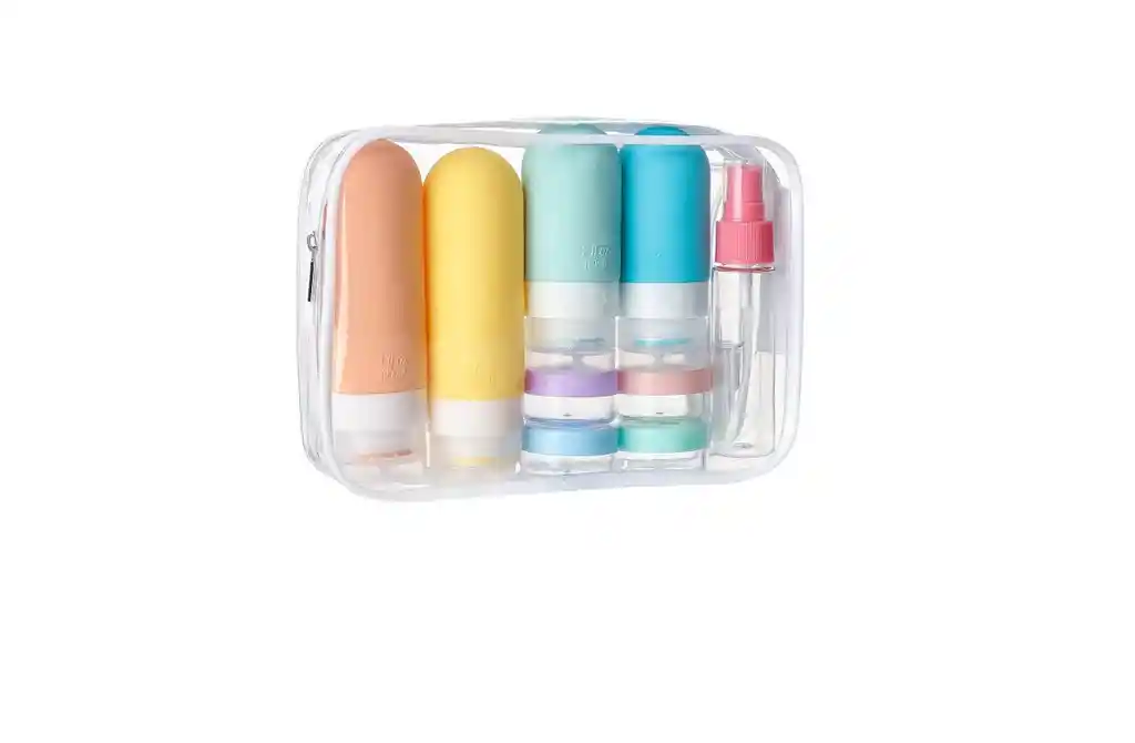 Accesorios de viaje útiles: este es un práctico juego de contenedores de viaje dentro de una caja con cremallera, que incluye 4 botellas de viaje, 4 frascos de viaje, 2 botellas de aerosol, 2 cucharas, 1 embudo, 1 cepillo de limpieza y 1 etiqueta, así como 1 bolsa de maquillaje transparente. Los diversos envases le permiten traer diferentes productos de belleza y cosméticos según sus necesidades. Botella de viaje a prueba de fugas: el diseño a prueba de fugas evita que el líquido se filtre o se derrame, proporcionando protección para tu equipaje y ropa. El diseño en forma de bola garantiza que ningún líquido quede atrapado en las esquinas de la botella, y te ayuda a usar la última gota de tus productos de cuidado personal sin desperdiciar ninguno. Ofrecemos botellas de viaje a prueba de fugas para usted.