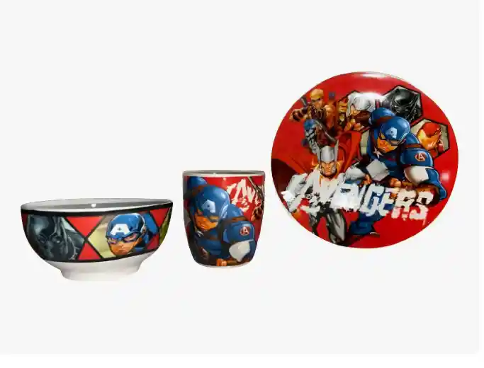 Juego de 3 piezas de Marvel Avengers para regalo o uso diario con los más pequeños de la casa. Consta de cuenco, taza y plato, ideal para cualquier comida. Todo el juego está decorado para combinar con diseños originales basados en los personajes infantiles más conocidos del mundo del cine y la televisión.