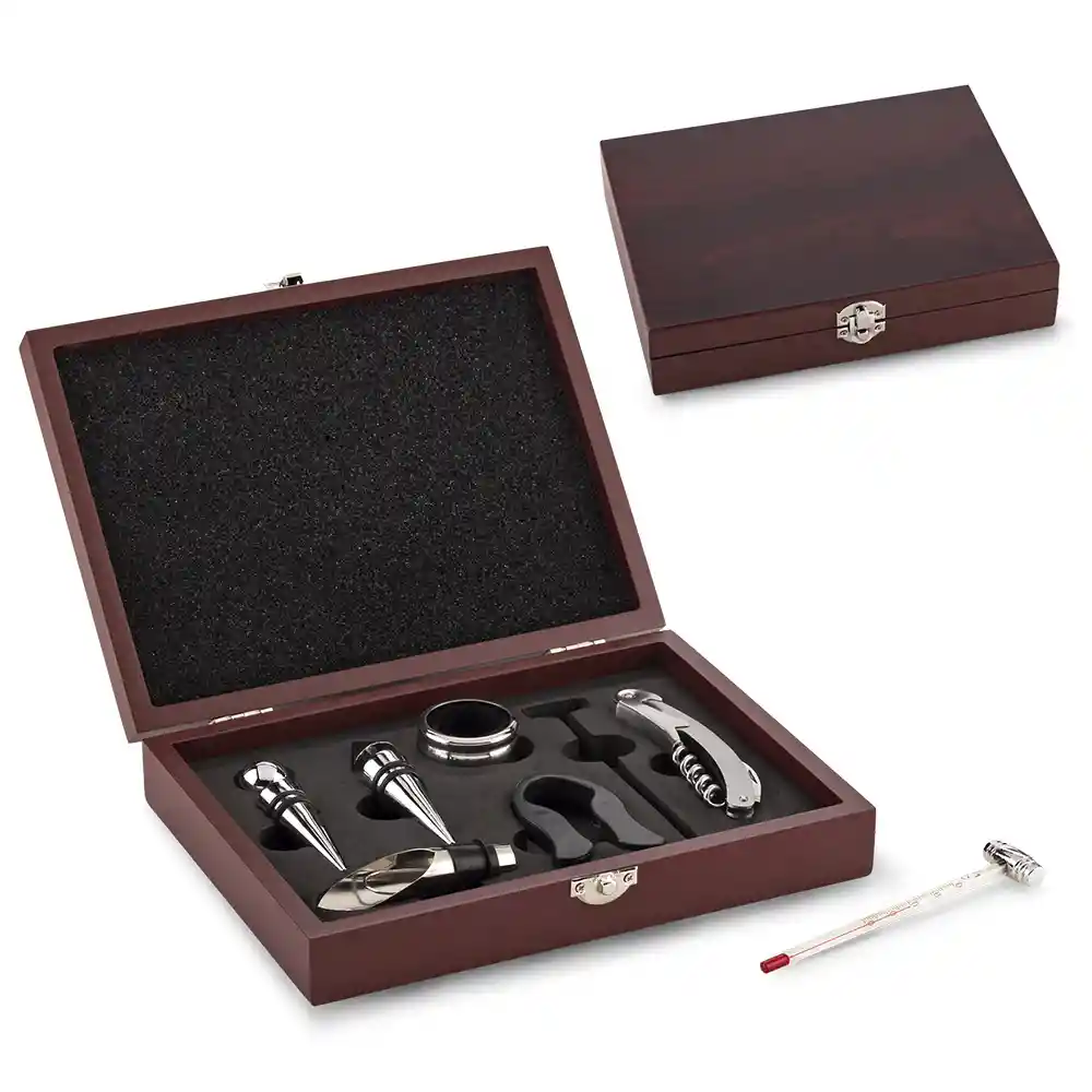 Landik trae para ti este elegante y sofisticado set de vino en madera que incluye 2 corchos, dosificador, cortador, termómetro, destapador y argolla antigoteo. Viene en caja de madera con el que puedes sorprender a tus invitados. Perfecto para regalo