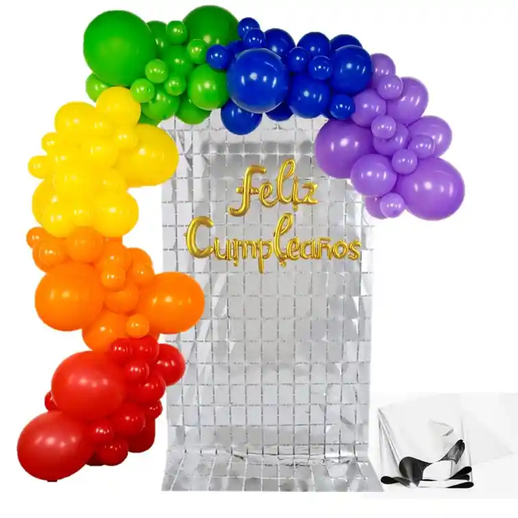 Kit de decoración feliz cumpleaños 1 cortina plateada metalizada de cuadros largo de 2 metros 1 globo de feliz cumpleaños color dorado 1 mantel plateado variedad de globos rojos, naranja, amarillo, verde, azul y morado DE LATEX disponibilidad inmediata nota: globos se envían sin inflar, si deseas adicionar mas productos indícanos y con gusto te colaboramos