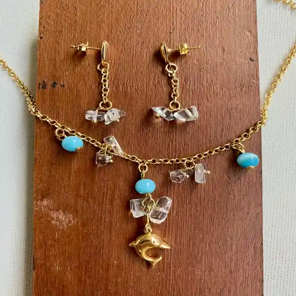 Set Aretes+Collar Delfin Diseño Exclusivo en Herraje Goldfilled 1420, acompañado por Piedras Cuarzo Transparente (tiene poder de atraer las energías positivas) y Ojo de Gato color azul turqueza (asociada con la limpieza y la protección) Nuestras Piedras son Originales El GoldFilled 1420 Se fabrica combinando capas de aleación de oro de 14 kt con un metal base - generalmente de latón. Tiene un enchape 50 veces más gruesa que el baño galvanoplastia en oro normal. Mediante la combinación de capas de aleación de oro sobre un metal de base (por lo general de latón) se enrollan con el grosor y forma deseados. Los Herrajes son conocidos por su durabilidad y puede ser usada sin reacciones ni dificultades en la mayoria de personas