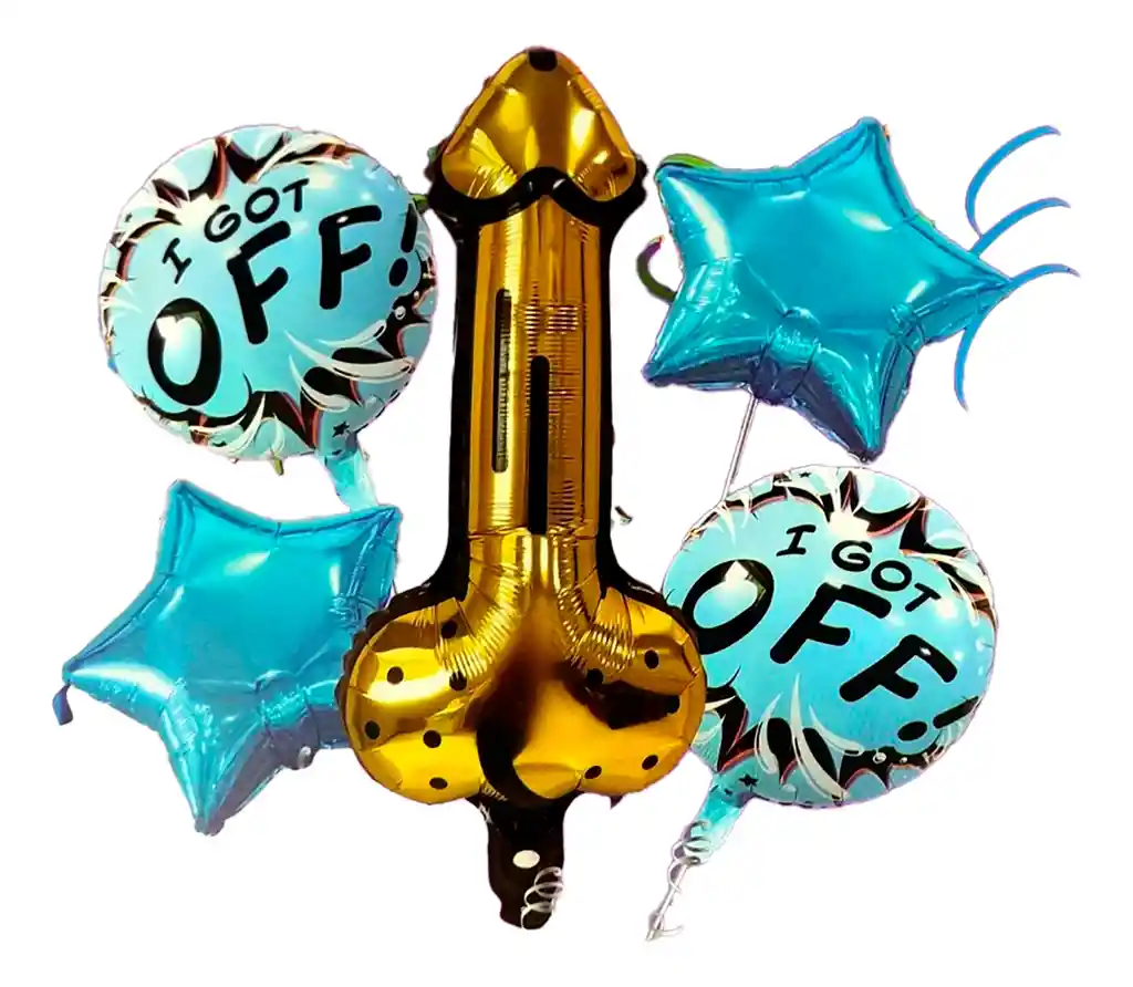 Set de despedida de soltera incluye 1 globo de pene dorado 2 globos de estrella azules 2 globos redondos azul claro los globos se envian sin inflar manejamos gran variedad de productos