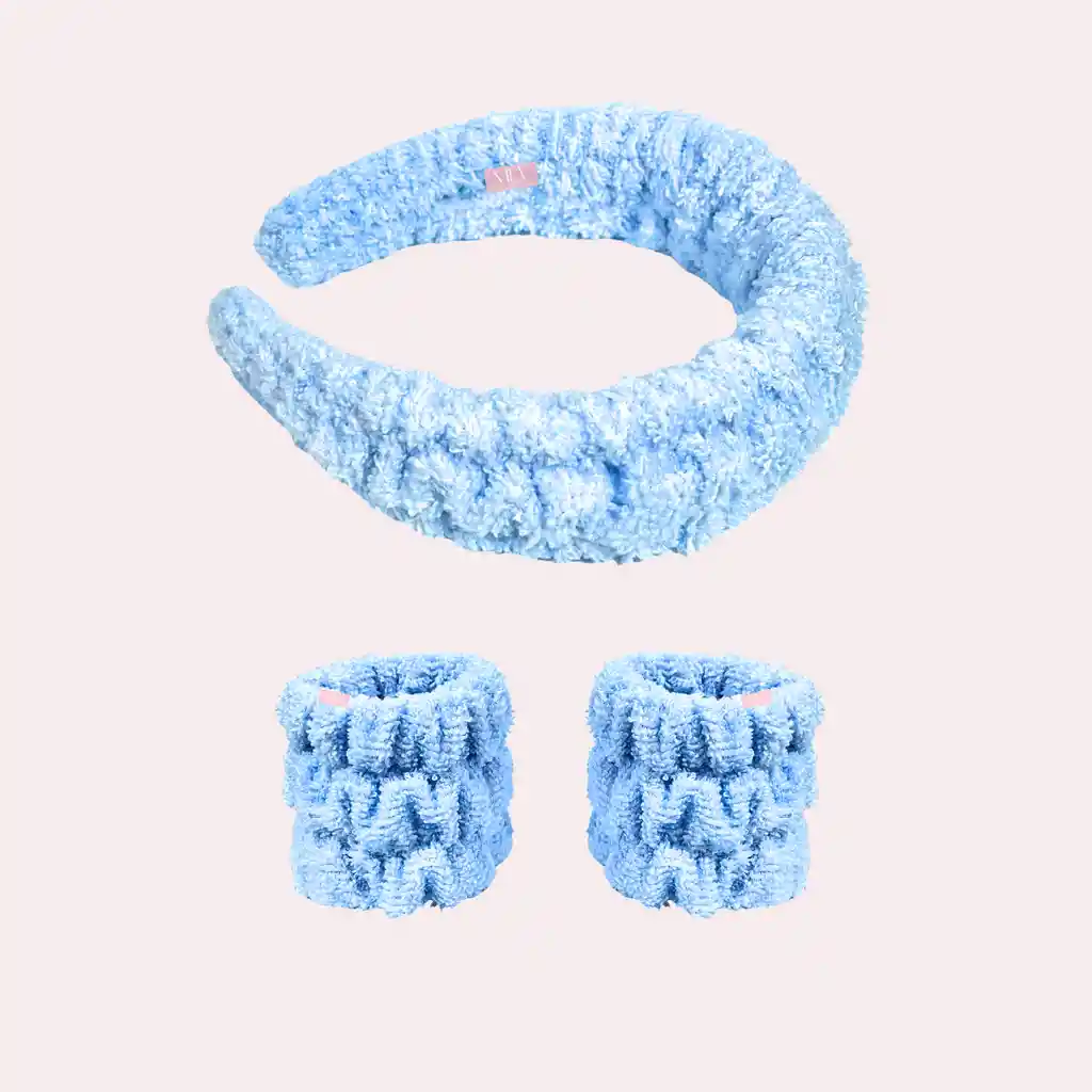 Set Diadema + Muñequeras Absorbentes Antigoteo para Cuidado Facial Incluye: - 1 diadema - 1 par de muñequeras Material: Microfibra Color: Azul claro Medida: Estándar. Su diseño se adapta cómodamente a todos los tamaños Este set exclusivo está diseñado para ofrecerte una experiencia de cuidado facial sin complicaciones. * Diadema: Perfecta para mantener tu cabello en su lugar durante tu rutina de limpieza, aplicación de mascarillas, spa y maquillaje. La diadema cuenta con forro removible que facilita su lavado, manteniéndola siempre limpia y lista para cada uso. * Muñequeras: Estas muñequeras han sido diseñadas para evitar esos molestos goteos en los codos que suelen ocurrir al lavar tu rostro, proporcionando una experiencia de cuidado personal más cómoda y libre de complicaciones. * Confeccionados con microfibra de alta calidad, este material es suave, agradable al tacto y altamente absorbente. ¡Haz que tu cuidado facial sea un verdadero placer! *Las imágenes de los productos pueden variar ligeramente en color respecto al producto real debido a la iluminación y las configuraciones de pantalla en diferentes dispositivos.