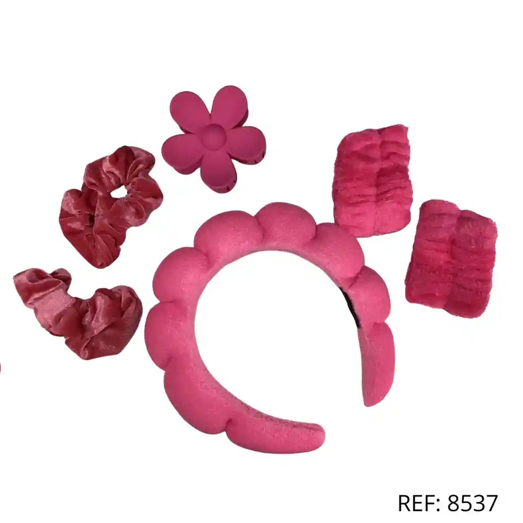Set rosa vibrante con diadema, moñas y pinzas. Perfecto para looks coloridos y divertidos.