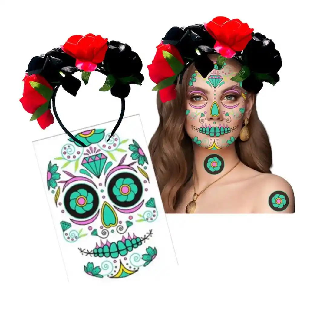 Set diadema flores artificiales + Maquillaje Halloween que brilla en la oscuridad Tatuaje Temporal fácil de aplicar y retirar. Contenido del paquete: 1 Diadema de flores rojas con negro 1 tatuaje temporal neón segun la elección. Hágalo usted mismo, espectacular maquillaje para Halloween o fiestas tematica Mexicana Tatuaje temporal de alta calidad. Brilla en la oscuridad. Fácil de aplicar, resistente y duradero. Se adapta a cualquier tamaño de la cara, Hombres, mujeres y niños. Quita fácilmente con aceite de niños o crema. INDICACIONES DE USO -Déjalo cargar con la luz natural para que brille en la oscuridad antes de la aplicación. Recorte las formas individuales. Los ojos son fáciles de aplicar si corta a la mitad horizontalmente y luego lo empata. No poner sobre la ceja ya que no le va a pegar. Luego aplíquelas por partes una por una. La piel debe estar seca y libre de maquillaje, limpie muy bien para eliminar todos los aceites o grasas en la piel (si no lo hace el tatuaje no se agarrara a la piel. Empiece a aplicar desde la parte superior de la cara y vaya bajando para proteger lo colocado. Empape con agua una esponja, paño o mota de algodón, haga una ligera y firme presión sobre el tatuaje sin moverlo ya que se deformara (.Aprox 30 segundos) Luego retire suavemente el papel, pruebe en el borde si ya despego, sino humedezca nuevamente, presione suavemente e intente de nuevo. Moje suavemente su cara cuando haya terminado para mejor resultado. Una vez colocadas todas las partes y el tatuaje este totalmente seco, puede aplicar el maquillaje (cara blanca, contorno de ojos Negro o variar con colores, para completar el look de calavera catrina Mexicana. No aplicar en personas con piel sensible o dentro del ojo, o alergicas al adhesivo.