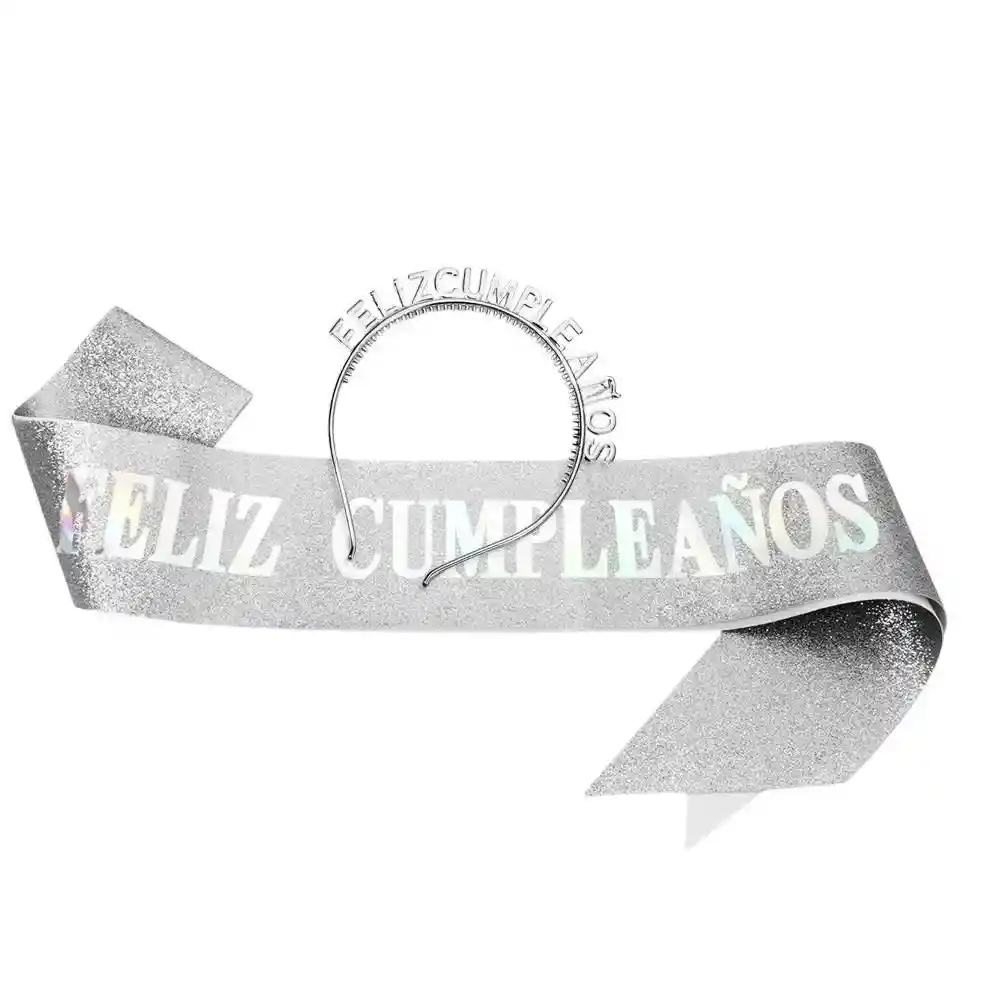 Set Diadema Vincha Con Banda Feliz Cumpleaños Plateada