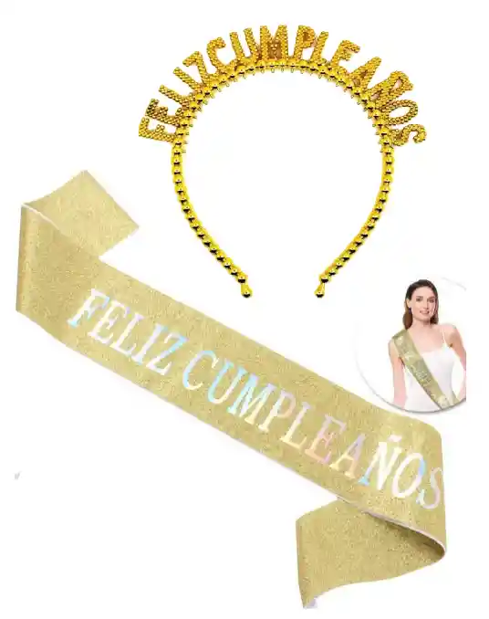 Hermoso Set Diadema Vincha Con Banda Feliz Cumpleaños Dorada