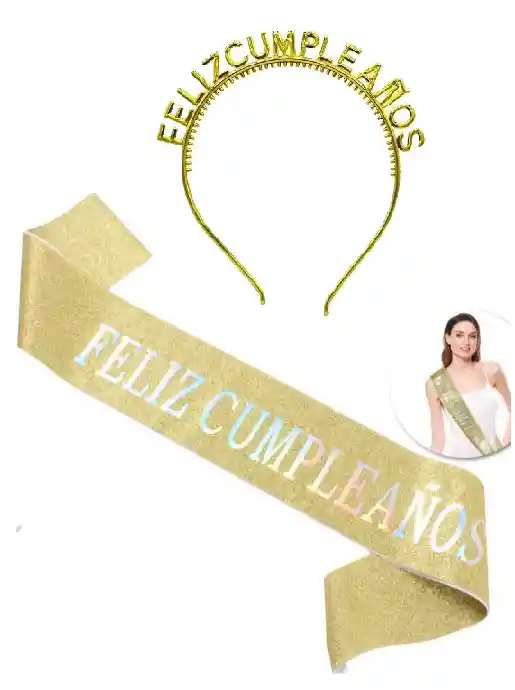Set Diadema Vincha Con Banda Feliz Cumpleaños Dorada