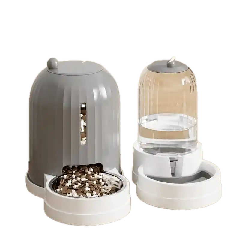 Set de dispensadores automáticos separados para comida y agua. Dispensador de alimento seco con capacidad de 2.7 litros y diseño moderno con ventana lateral para monitorear contenido, dimensiones aproximadas 30 × 25 × 19 cm. Bebedero con botella transparente de 1.6 litros y sistema de liberación automática por gravedad, dimensiones 22.5 × 24 × 16 cm.