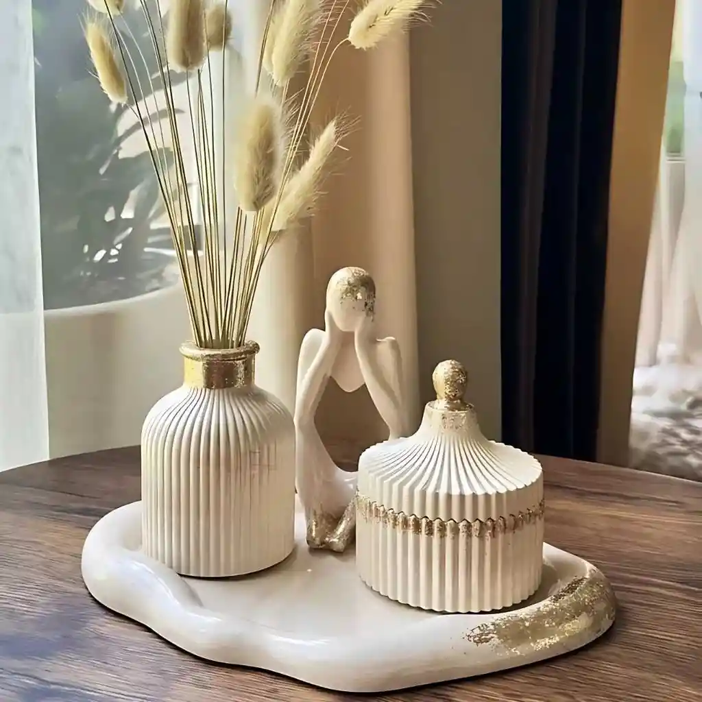 Contiene Bandeja Florero Escultura Cofre Color: blanco con dorado Material: concreto