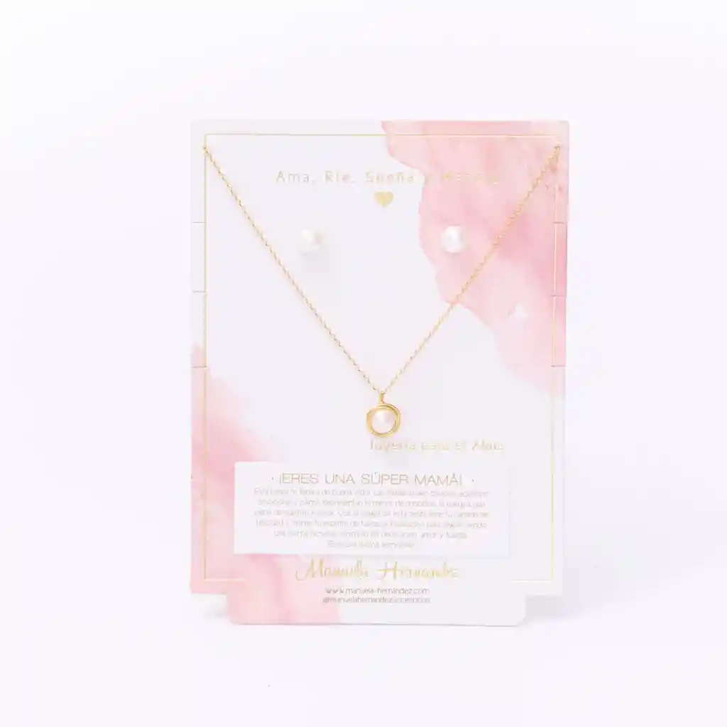 La cadena y los apliques dorados cuentan con Baño de Oro 18k. Elaborado con Perlas Naturales. Longitud: 45 cm. Incluye Collar y Aretes.