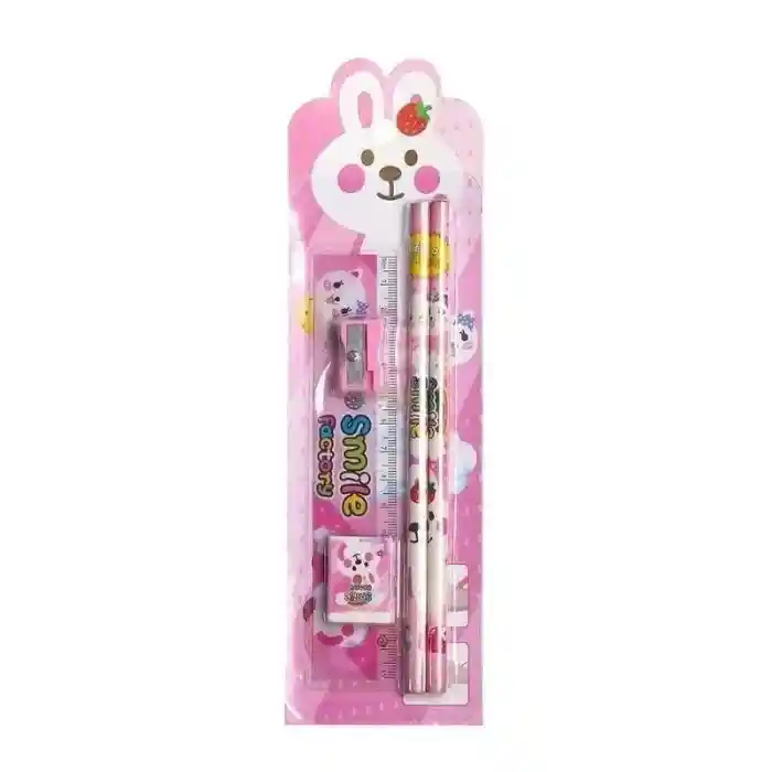 Set Escolar con Lápiz, Regla, Tajalápiz y Borrador Incluye: - 2 lápices de grafito con diseño de conejo - 1 regla de 15 cm - 1 borrador - 1 sacapuntas Características: Características: - Diseño divertido y llamativo: Motivo de conejo en tonos rosados, perfecto para niños y niñas que disfrutan de útiles escolares creativos y coloridos. - Materiales livianos y resistentes: Ideales para el uso diario en el colegio o en casa. - Tamaño práctico: Fácil de guardar en la cartuchera o mochila escolar. - Uso versátil: Perfecto para clases, tareas, dibujos, actividades creativas y manualidades. - Excelente opción de regalo: Ideal como detalle escolar, regalo sorpresa, incentivo académico o complemento para kits escolares. Un set funcional y adorable que hará que estudiar sea mucho más divertido.