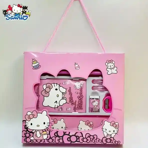 El set escolar con libreta Sanrio - Hello Kitty incluye una encantadora libreta, bolígrafos y accesorios decorados con el icónico personaje. Ideal para la escuela o el hogar, combina estilo y funcionalidad, haciendo que las tareas y actividades creativas sean más divertidas y llenas de encanto. Palabras clave: set escolar | libreta | Hello Kitty | Sanrio | diseño | personajes | útiles | funcionalidad | niños | creativo