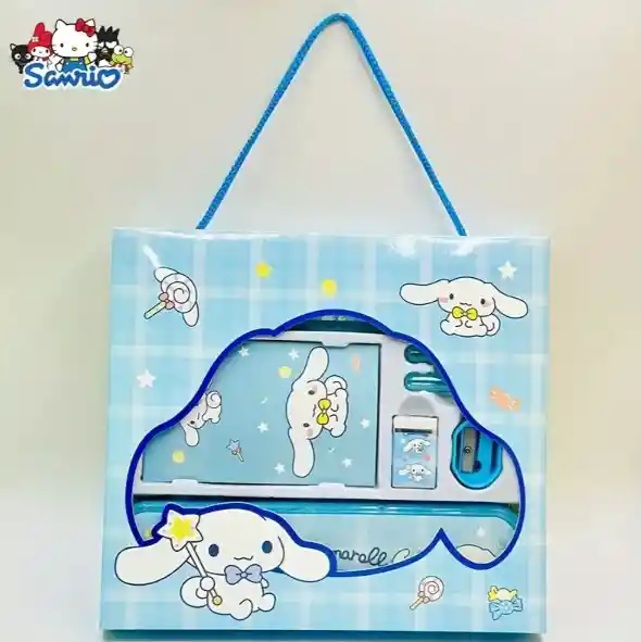 El set escolar con libreta Sanrio - Hello Kitty incluye una libreta con diseño exclusivo, bolígrafos y útiles esenciales decorados con el encanto del icónico personaje. Perfecto para la escuela o actividades en casa, combina funcionalidad y estilo, haciendo cada tarea más divertida y especial. Palabras clave: set escolar | Hello Kitty | Sanrio | libreta | útiles | diseño | niños | funcionalidad | creativo | divertido