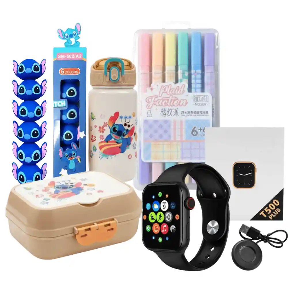 TODO EN UNO Cuando buscas una solución completa para el colegio, este set responde sin complicaciones. Reúne en un solo paquete los elementos que un niño usa a diario, evitando compras separadas y asegurando coherencia en diseño y funcionalidad. Es una opción pensada para padres prácticos que valoran el tiempo, el orden y una compra inteligente. Todo encaja, todo se usa, nada sobra. Un combo que simplifica la rutina escolar desde el primer día. Especificaciones Combo escolar infantil, materiales plásticos de alta durabilidad, lonchera rígida fácil de limpiar, termo reutilizable apto para bebidas frías, resaltadores de tinta color pastel, smartwatch T500 con pantalla táctil y correa ajustable. Incluye Lonchera + termo + resaltadores x6 + reloj inteligente T500. Medidas del combo empacado: 30 cm alto x 25 cm ancho x 15 cm largo, peso aproximado 1.2 kg. Garantía Garantía de 30 días por defectos de fabricación. Política de Retracto 5 días hábiles desde la recepción del producto, siempre que esté completo y sin uso. Nota Importante Si el producto llega golpeado o con piezas faltantes, repórtalo en las primeras 24 horas a la transportadora. Para aplicar la garantía, envía fotos y videos donde se evidencie el defecto.