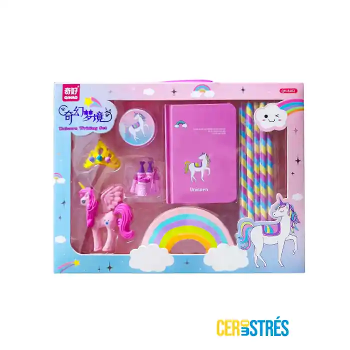 Set escolar unicornio Agenda, borradores y lápices. Tú o tu persona especial recibirán el regalo perfectamente empacado en materiales hermosos, con una tarjeta personalizada con el texto que tu nos envíes.