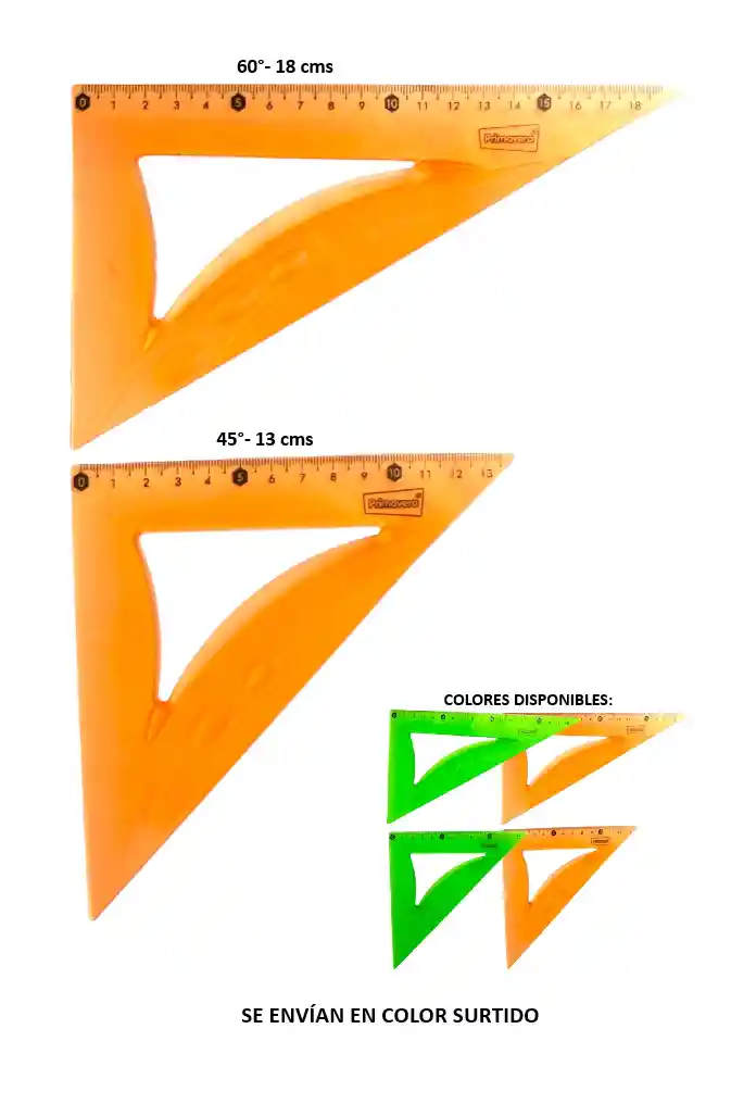 Set de 2 escuadras Flexibles Medidas: 13cm/45° y 18cm/60° Material: Poliestireno cristal de alta resistencia Se envía un set de color surtido.
