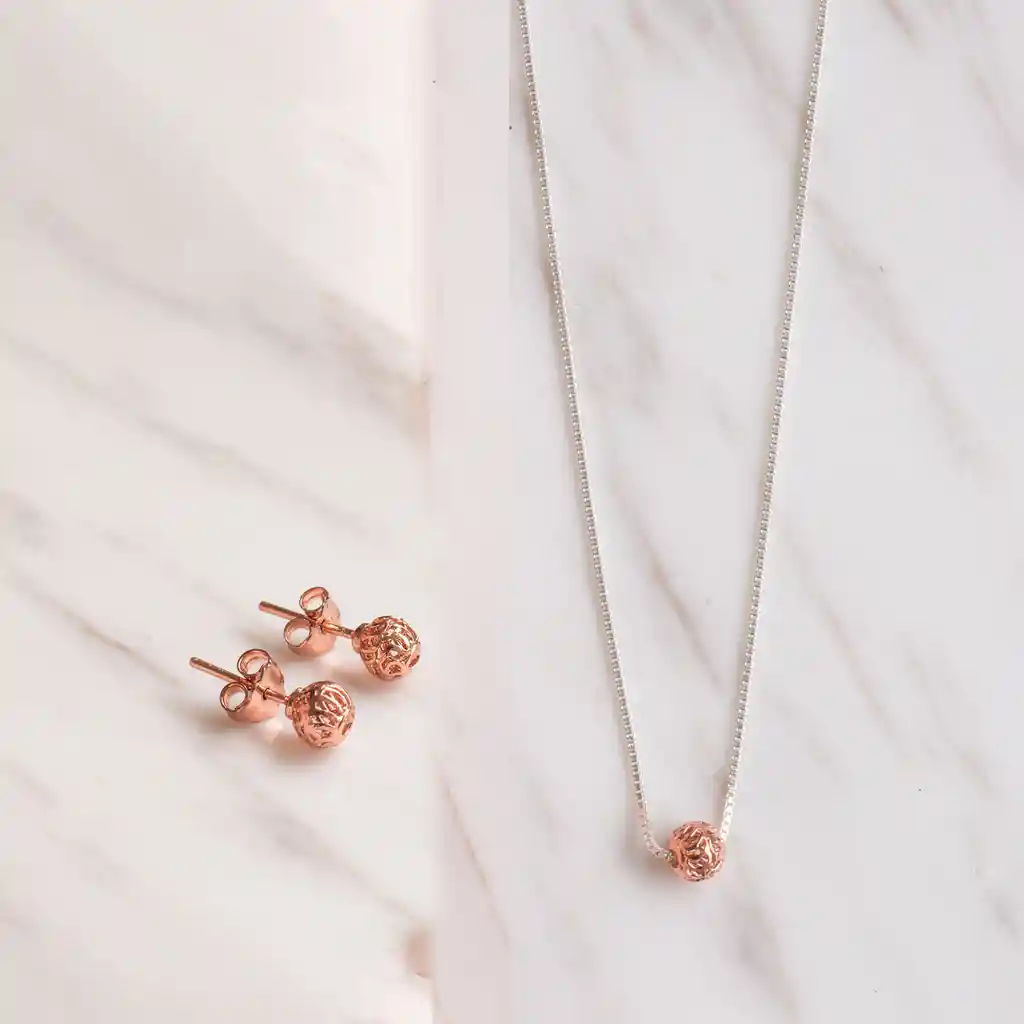 Si buscas la belleza en la simplicidad, nuestro Set Esfera Mini es la elección perfecta. Cada pieza de este conjunto ha sido cuidadosamente elaborada en filigrana momposina, un arte que ha perdurado a través de generaciones. Tienen chapado en oro rosado, además de una capa protectora de laca cataforética para mantener su brillo inalterable. Este conjunto es parte de nuestra colección de básicos, diseñada para quienes aprecian la elegancia en su forma más pura. Collar Esfera Mini: Simplicidad Sofisticada El collar Esfera Mini es una joya que encarna la simplicidad sofisticada. Su diseño minimalista en topitos de filigrana momposina aporta un toque de encanto a cualquier atuendo. Llévalo solo o combínalo con los aretes a juego para una apariencia coherente y refinada. Este collar es ideal para resaltar tu belleza natural y tu estilo único. Aretes Topitos: Detalles que Marcan la Diferencia Los aretes Topitos son pequeñas obras de arte que realzan tu elegancia. Cada topito en filigrana momposina destaca por su delicadeza y artesanía. Son ligeros y cómodos, perfectos para el uso diario o para ocasiones especiales. Estos aretes son una declaración de estilo sutil que muestra tu buen gusto en cada detalle.