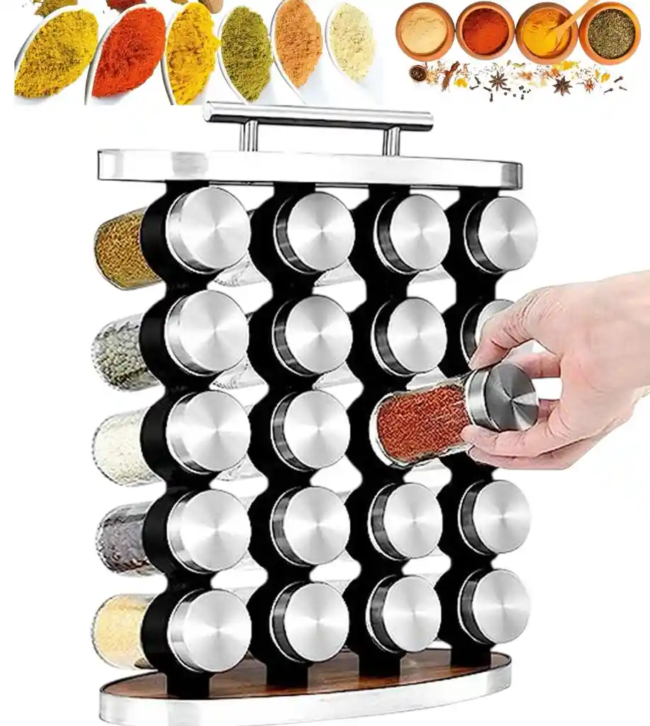 Organiza tu cocina de forma práctica y con estilo con este especiero de 5 niveles que incluye 20 frascos de acero inoxidable. Ideal para colocar sobre la encimera o mesa, este especiero no solo ahorra espacio, sino que también aporta un toque moderno y sofisticado a tu cocina. Cada frasco está fabricado con vidrio de borosilicato de alta resistencia y cuenta con una tapa metálica y un inserto tipo coctelera, lo que permite una dosificación precisa y cómoda de las especias. Su diseño transparente te ayuda a identificar rápidamente el contenido, haciendo que cocinar sea más eficiente y placentero. Este estante, hecho de madera de alta calidad y acero inoxidable, es fuerte, duradero y resistente a la deformación. Gracias a su diseño abierto y portátil, puedes moverlo fácilmente a cualquier parte de la cocina sin tener que esconderlo en gabinetes. Una pieza funcional que también se convierte en una excelente decoración para tu espacio.