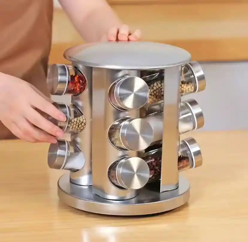 Set condimentero Kit especiero • Organizador 12 frascos para especias y condimentos. • Estante giratorio 360º para tu comodidad. • Material de alta calidad y buen sellado. • Optimiza el espacio en tu cocina. • Diseño elegante. Detalles del producto Medida frasco: 4.2cm diámetro x 9.3cm alto (Medidas aproximadas) Medida estante: 19cm diámetro x 21cm alto (Medidas aproximadas) Material frasco: Vidrio Material estante: Acero y ABS. Capacidad frasco: 80g (Medida aproximada) Peso con frascos: 1.7Kg (Medida aproximada) Incluye: 1 set condimentero x12 frascos de vidrio