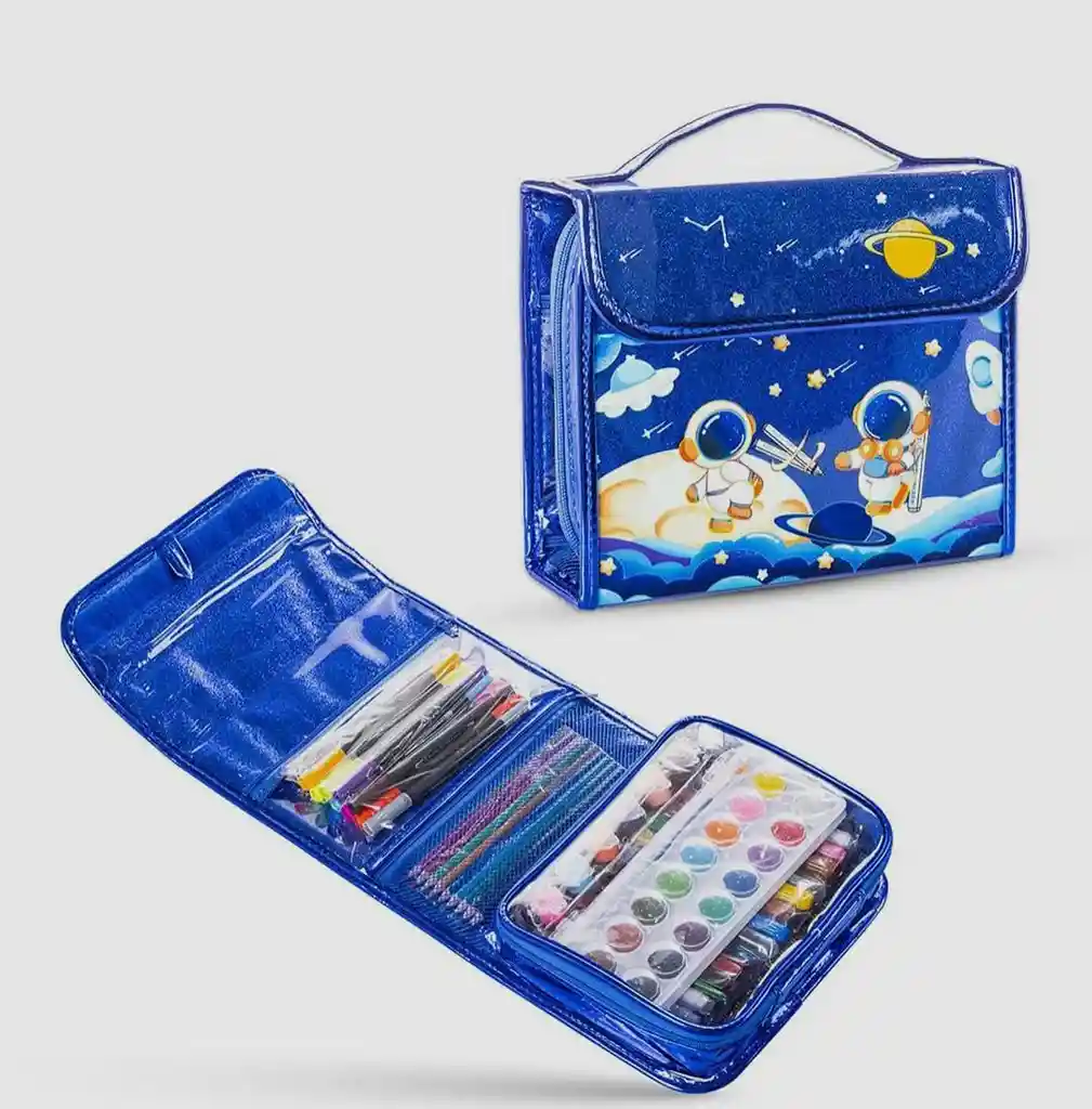 Estuche ideal para estimular la creatividad de niños y niñas. Disponible en divertidos diseños temáticos, ofrece todo lo necesario para dibujar, pintar y crear en cualquier momento. Incluye marcadores, colores, pinturas, pinceles y un práctico cuaderno, organizados en compartimentos internos para mayor orden y facilidad de uso. Su diseño plegable con cierre y permite transportarlo cómodamente al colegio, viajes o actividades en casa. Un kit completo, funcional y entretenido que fomenta la imaginación, la concentración y el aprendizaje, perfecto como regalo para cualquier ocasión.