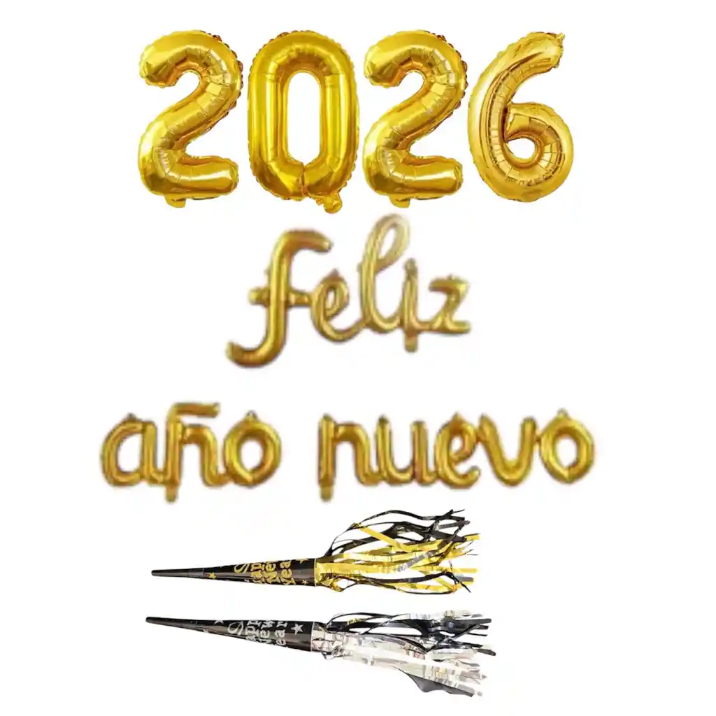 Set o kit feliz año que contiene Pitos espanta suegra Letrero inflable color dorado que dice Feli Año Nuevo 4 numeros metalizados de color dorado 2026 de 32 pulgadas GRANDE
