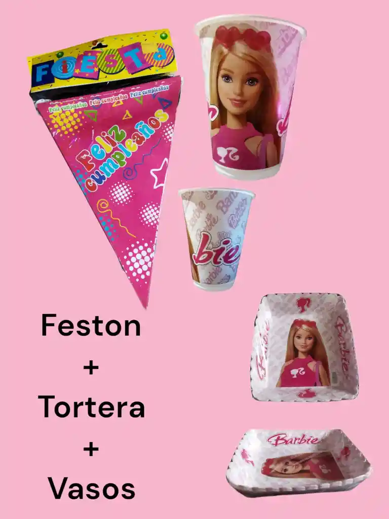 DECORA TU FIESTA CON BARBIE EL SET CONTIENE: •1 FESTON BARBIE •12 PLATOS CARTÓN TORTERO • 12 VASOS PLÁSTICO