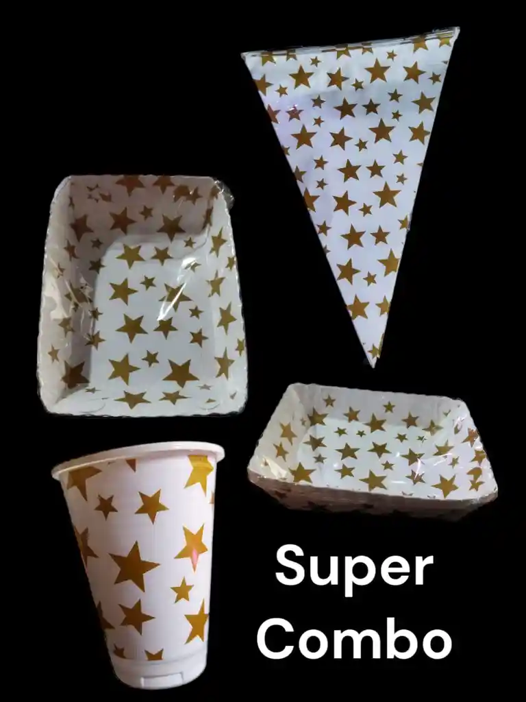 Set Fiesta Estrellas doradas: Festón, Tortera x 12 y Vasos x 12 EL SET CONTIENE: •1 FESTON BARBIE •12 PLATOS CARTÓN TORTERO • 12 VASOS PLÁSTICO 7 ONZ