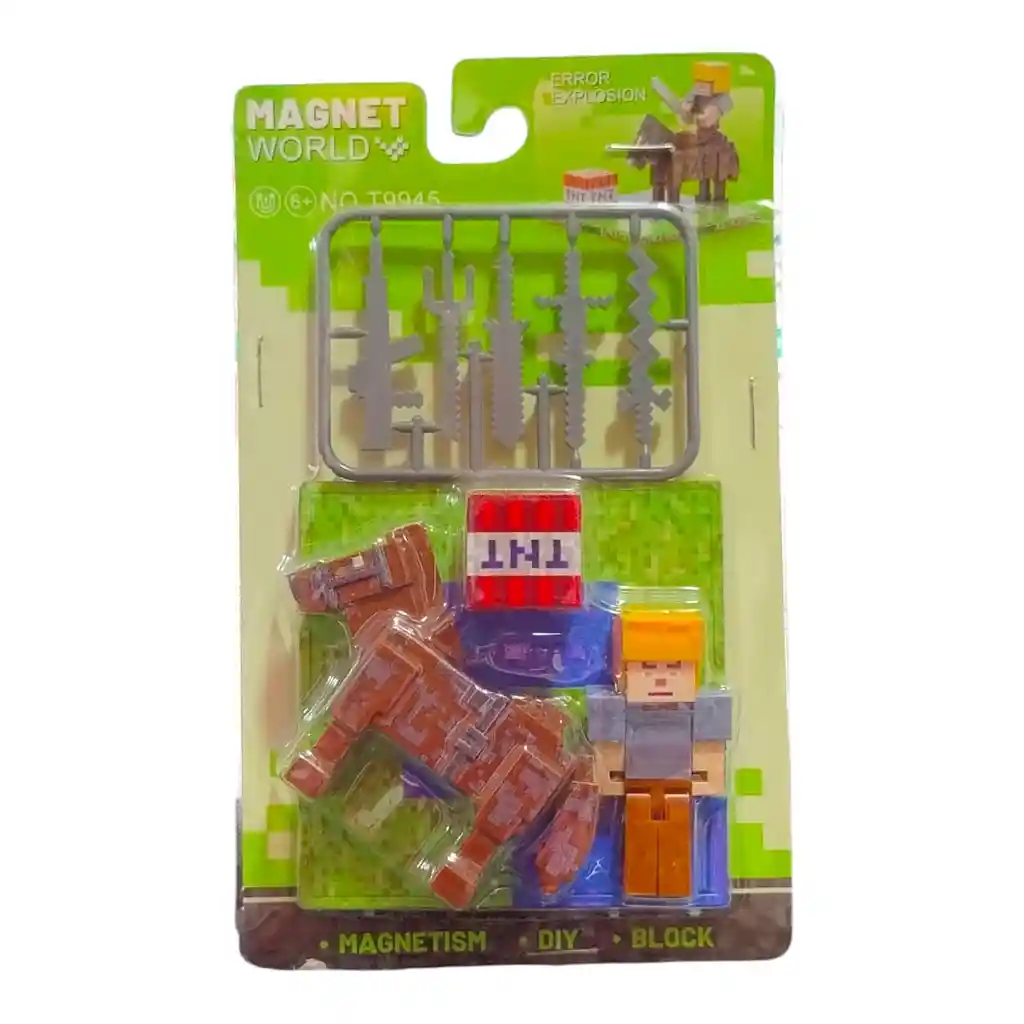 Lleva la aventura al siguiente nivel! Este set tipo Minecraft incluye una figura articulada, un caballo armable, bloque de TNT y un arsenal de armas desmontables para construir tu mundo pixelado como quieras. Ideal para niños amantes de los juegos de construcción, aventura y figuras coleccionables. Diseñado para mayores de 6 años, este juguete fomenta la creatividad y el juego imaginativo, con piezas que se ensamblan fácilmente y detalles tipo bloques. Incluye: 1 figura estilo Minecraft 1 caballo articulado 1 bloque TNT 5 armas tipo pixel (espadas, lanzas y más) Compatible con figuras similares