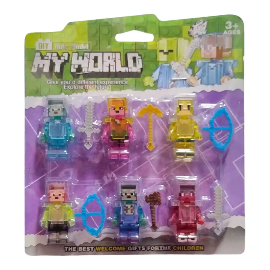 Diversión creativa para los fanáticos de los bloques! Este set incluye 6 figuras inspiradas en el mundo de Minecraft, con diseños coloridos y translúcidos, ideales para juegos de construcción, aventura y rol. Cada personaje viene con su propia arma o accesorio (espadas, picos, arcos, martillos), perfecto para estimular la imaginación de los niños. Ideal para regalar y coleccionar, este juguete es compatible con bloques tipo LEGO y está pensado para niños mayores de 3 años. Características destacadas: 6 figuras tipo Minecraft con estilo pixelado Incluye accesorios: espadas, arcos, picos y más Compatible con otros bloques armables A partir de 3 años Ideal como regalo o detalle sorpresa