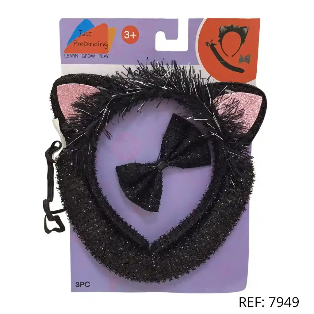 Set de gatita negro con orejas, moño y cola. Ideal para fiestas, juegos o Halloween.
