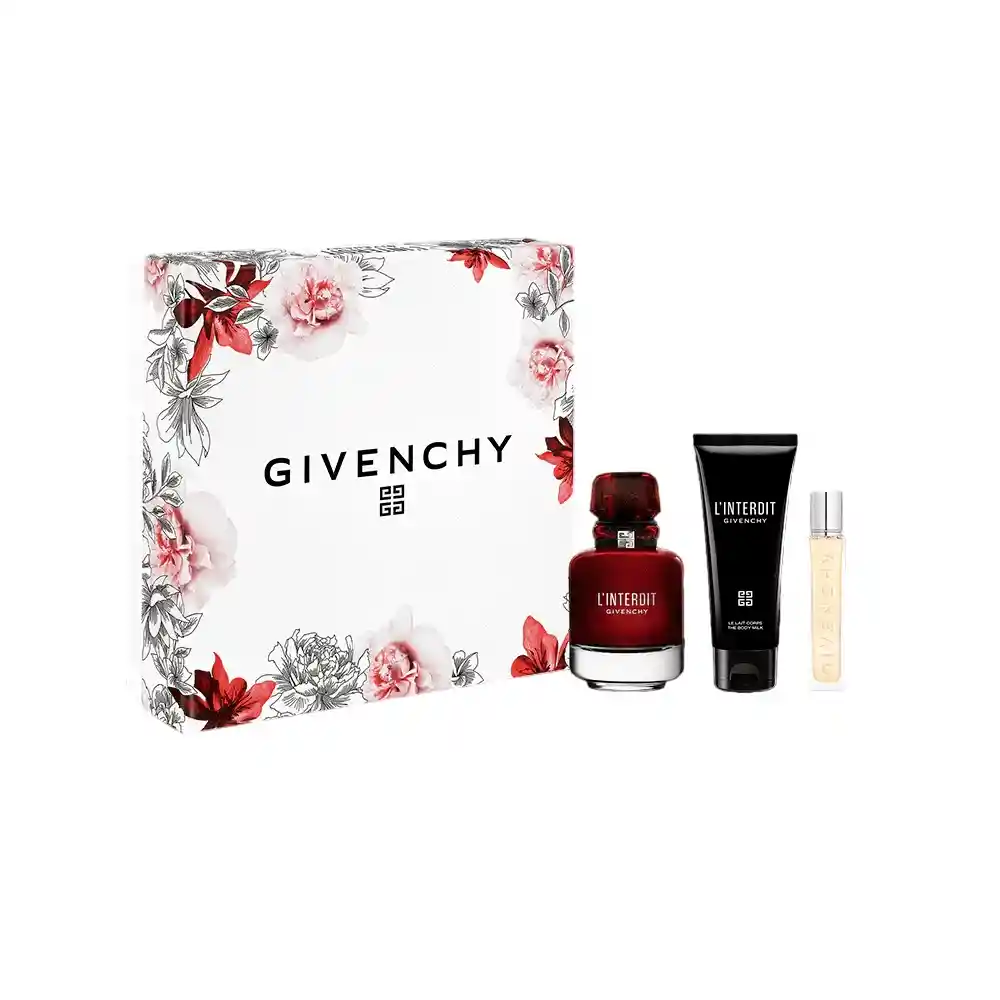 "Este año, rinde homenaje a su radiante belleza con un estuche de fragancias Givenchy, que incluye un Eau de Parfum Rouge, una loción corporal y un spray de viaje. Givenchy se adentra en las obsesiones sensuales con L'Interdit Eau de Parfum Rouge. Incandescentes, las flores subterráneas brillan en rojo."