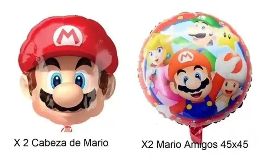 *********************GLOBOS Y PELUCHES MASMELO********************* - Por tu compra llevas: 2 Globo Mario Bros Cabeza 53 x 53 cm 2 Globos amigos de Mario 45 x 45 cm Impresion en doble cara Material: metalizado Foil. *Los globos se entregan desinflados, tu compra no incluye el montaje ni la decoración, el servicio de armado no lo tenemos disponible. sin embargo te damos todas las instrucciones para hacer de modo profesional. Si deseas adicionar otros articulos a tu compra puedes escribirnos, recuerda que Somos Globos y Peluches Masmelo ;) - En ciudades fuera de Bogotá despachamos para el mismo día si compras antes de las 11AM (no incluye festivos) - En Bogotá despachamos para el mismo día, si haces el pedido antes de las 4PM (no incluye festivos)