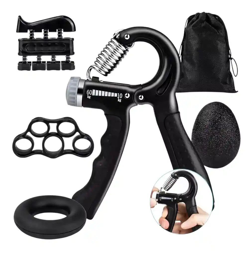 HOLA SOMOS DISTRIBUICIONES JELOKIDS ¡Ejercita con tu set fortalecedor del agarre de mano y fortalecedor de dedos, antebrazo y muñeca Fitnics! - 5 accesorios para ejercitar y fortalecer tus fuerza de presión + bolsa de guardado. - El Hand Grip cuenta con ajuste fácil de resistencia entre 5 y 60 kg que se opone al cerrarlo, integra un monitor de conteo digital automático, para que puedas cuantificar fácilmente tus repeticiones y cuenta con resorte de acero reforzado, que lo hace durable y resistente. - Ejercitar tus dedos, antebrazo y muñeca, mejora la fuerza de presión lo cual puede ayudar a mejorar en muchos de tus deportes favoritos como tenis, calistenia, levantamiento de pesas, entre otros. - Puedes revisar nuestras imágenes para ver ejemplos de tipos de ejercicios - Todos los accesorios se potencian para lograr un mejor trabajo muscular. ----------------------------------------------------------------------- FICHA TÉCNICA - Materiales: ABS + goma antideslizante + resorte de acero reforzado - Color: Negro - Medidas hand grip: 16 x 10 x 2 cm - Peso total: 370 gr ----------------------------------------------------------------------- QUE VIENE EN LA CAJA - 1 set fortalecedor de agarre Fitnics: - 1 Hand Grip - 1 Esfera de mano antiestrés - 1 Aro de agarre - 1 Ejercitador de dedos y mano - 1 Banda elástica para dedos - 1 Bolsa para guardado Vendemos productos de gran calidad Gracias por visitar nuestra pagina y de antemano agardecer la compra