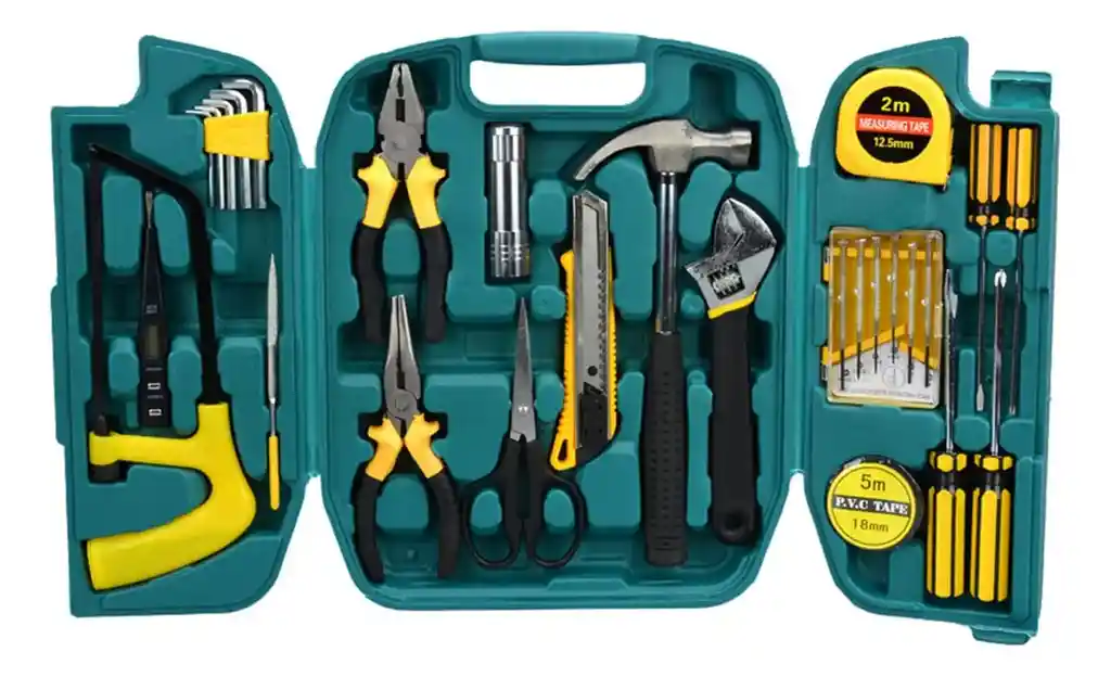 El set de herramientas multiuso de 27 piezas es el aliado ideal para realizar reparaciones en el hogar o proyectos de bricolaje. Diseñado para brindar practicidad y eficiencia, este set contiene las herramientas más esenciales para enfrentar cualquier tarea de mantenimiento. La caja organizadora compacta y resistente facilita el transporte y almacenamiento, manteniendo todo en orden y al alcance de la mano. El kit incluye una combinación de llaves, alicates, destornilladores, martillo, cinta métrica, cúter y más, lo que lo hace versátil para múltiples aplicaciones, desde ajustes simples hasta reparaciones más complejas. Cada herramienta está fabricada con materiales duraderos y de alta calidad, garantizando una larga vida útil y un rendimiento confiable. Además, el mango de las herramientas cuenta con un diseño ergonómico para un agarre cómodo y seguro, minimizando la fatiga durante el uso prolongado. Este set es ideal para personas que buscan una solución práctica y completa para el hogar, ya que cubre necesidades básicas de reparación, ajustes y montaje de muebles, arreglos eléctricos, reparaciones menores en plomería, y más. La caja organizadora posee compartimentos especialmente diseñados para cada herramienta, permitiendo una fácil visualización y acceso rápido a lo necesario.