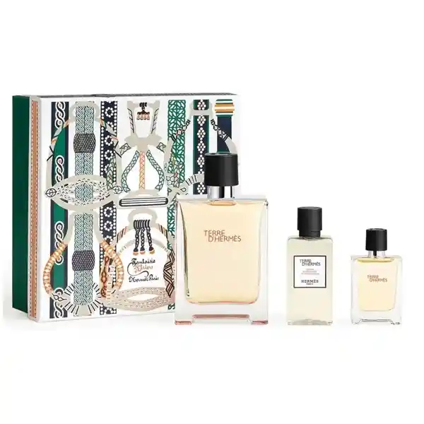 "Compuesto por motivos de inspiración ecuestre entrelazados, el diseño Fantaisie d’Étriers, obra de la ilustradora Virginie Jamin, contagia su particular brillo a este estuche festivo. Curvas, trenzas y líneas torcidas acapararán toda la atención en las celebraciones de fin de año. El estuche se compone de Eau de toilette Terre d”Hermès (100 ml), Eau de toilette (miniatura de 12,5 ml) y loción para después del afeitado (40 ml). Terre d'Hermès, una fragancia mineral y amaderada, combina la potencia del cedro y el esplendor del pomelo con una vibrante nota de sílex."