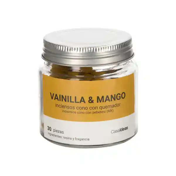 Set Casaideas Contiene 30 Unidades. Set de Inciensos Con Forma de Conos Olor a Vainilla y Mango Con Quemador. Medidas: Alto: 7.2 cm. Ancho: 6.7 cm. Profundidad: 6.7 cm. Composición: 60% Ethanol 40% Otro. "En Casaideas Encontrarás Artículos de Diseño. Para Vivir Día a Día en un Espacio Que te Haga Feliz."