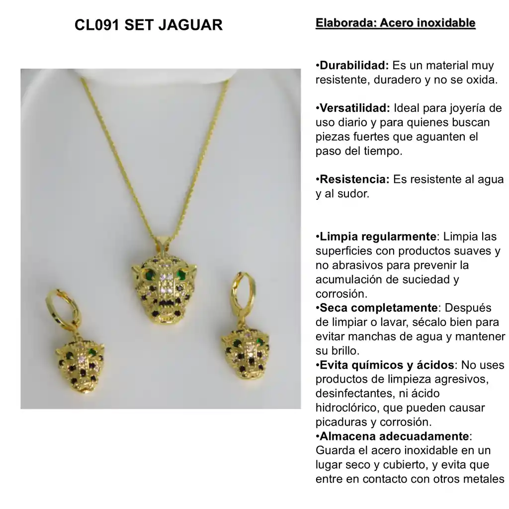 Elaborada: Acero inoxidable Durabilidad: Es un material muy resistente, duradero y no se oxida. Versatilidad: Ideal para joyería de uso diario y para quienes buscan piezas fuertes que aguanten el paso del tiempo. Resistencia: Es resistente al agua y al sudor. Limpia regularmente: Limpia las superficies con productos suaves y no abrasivos para prevenir la acumulación de suciedad y corrosión. Seca completamente: Después de limpiar o lavar, sécalo bien para evitar manchas de agua y mantener su brillo. Evita químicos y ácidos: No uses productos de limpieza agresivos, desinfectantes, ni ácido hidroclórico, que pueden causar picaduras y corrosión. Almacena adecuadamente: Guarda el acero inoxidable en un lugar seco y cubierto, y evita que entre en contacto con otros metales