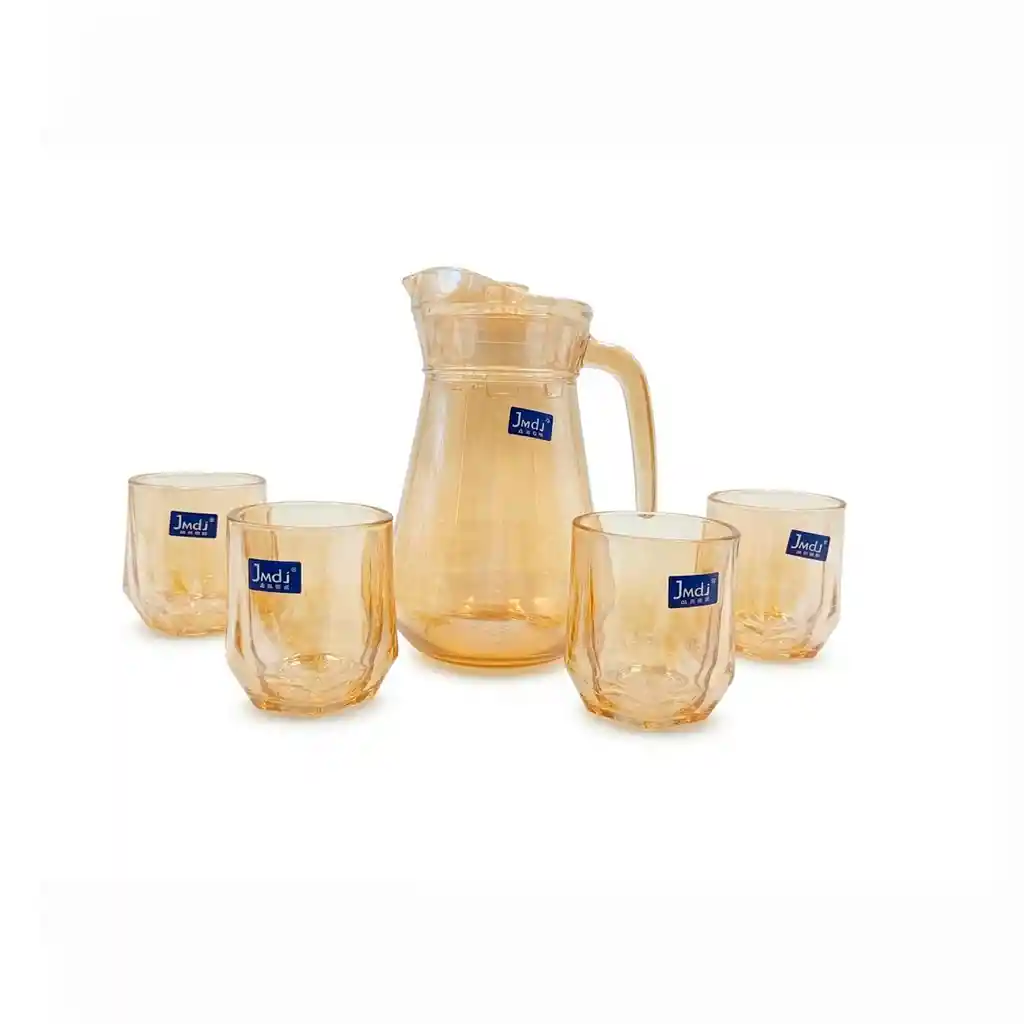 Fabricado en vidrio resistente y duradero. Color ámbar decorativo y sofisticado. Capacidad de la jarra 1.3 lts. Asa ergonómica de fácil agarre. Incluye 4 vasos a juego. Capacidad vaso de 300 ml (10 onzas). Diseño moderno y elegante. Boquilla que facilita el vertido.. Incluye tapa en policarbonato. Fácil de limpiar y mantener. No absorbe olores ni sabores. Apto para contacto con alimentos. Perfecto para uso diario. La imagen ha sido ambientada; no incluye accesorios adicionales y el color puede variar según la iluminación.