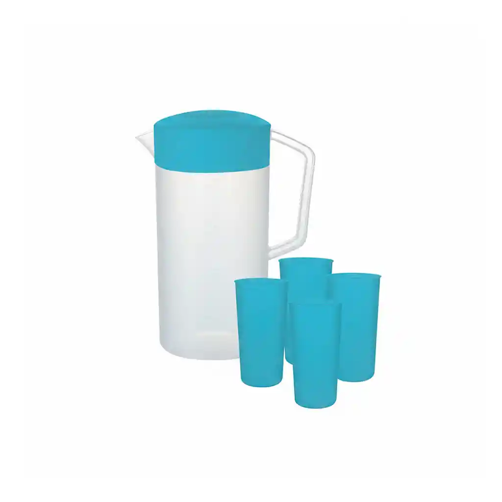 Incluye una jarra de gran capacidad de 2 litros y cuatro vasos de 8 onzas a juego para un servicio coordinado. Fabricado en plástico resistente de la marca Estra, ideal para el uso diario intensivo en el hogar. Su acabado permite ver el contenido y nivel de los líquidos de forma clara y estética. La tapa ajusta perfectamente para proteger tus bebidas de agentes externos y evitar derrames accidentales. La jarra cuenta con una manija robusta diseñada para un agarre cómodo y un vertido preciso sin esfuerzo. Los cuatro vasos de 8 onzas son ligeros, fáciles de manipular y perfectos para niños y adultos. Los vasos se pueden encajar entre sí para optimizar el espacio de almacenamiento en tus gabinetes. Todas las piezas poseen superficies lisas que permiten un lavado rápido, siendo aptas para lavavajillas. Evite someter el producto en su condición máxima/minima de temperatura durante periodos de tiempo prolongados. Este Producto es libre de BPA, apto para contacto con alimentos y adecuado para refrigeració. Su material es fácil de lavar, garantizando una limpieza rápida y eficiente. Se entrega en un empaque protegido para asegurar que las piezas lleguen en perfectas condiciones hasta la puerta de tu hogar.. Estos productos han sido ambientados, los accesorios adicionales no están incluidos y su color puede variar por la luz.. .