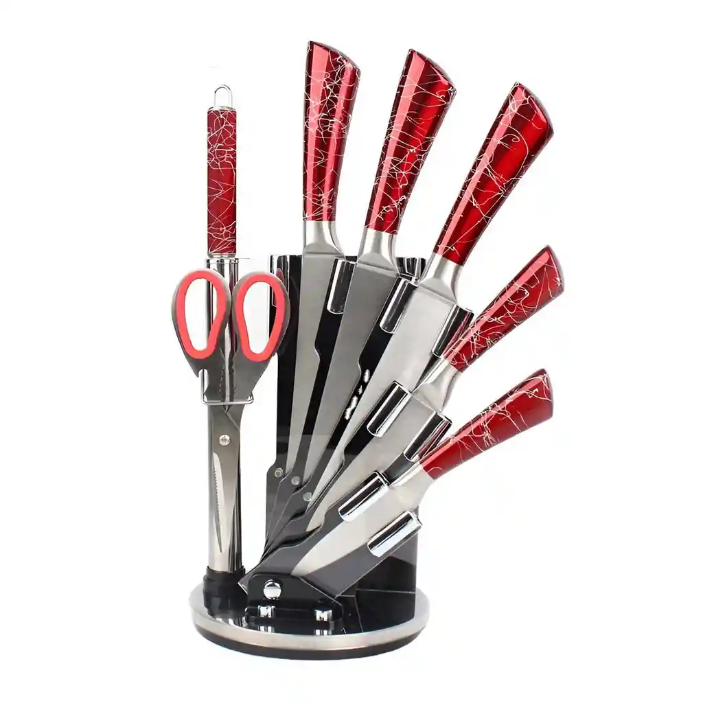 Este elegante set de cuchillos profesionales es la solución definitiva para equipar su cocina con precisión, estilo y durabilidad. Fabricados en acero inoxidable de alta calidad con hojas ultra afiladas, cada pieza garantiza cortes limpios y precisos en carnes, verduras, frutas y panes, optimizando su tiempo en la cocina. El juego destaca por su diseño ergonómico con mangos texturizados en un sofisticado acabado rojo marmoleado que ofrece un agarre seguro y cómodo, evitando la fatiga durante el uso prolongado. Incluye una base giratoria de 360 grados que mantiene sus herramientas organizadas y siempre al alcance, además de accesorios indispensables como tijeras de cocina y un chaira afiladora para mantener el filo impecable, convirtiéndose en el aliado indispensable tanto para chefs aficionados como profesionales. FICHA TÉCNICA Producto: Set de Cuchillos de Cocina Profesional Cantidad de piezas: 8 Piezas en total Material de las Hojas: Acero Inoxidable de alta calidad Material del Mango: Polímero ergonómico con acabado marmoleado Base: Soporte acrílico giratorio de 360 grados Incluye Cuchillo de Chef: Ideal para picar, rebanar y trocear Incluye Cuchillo Hachuela: Especial para cortes más robustos y huesos pequeños Incluye Cuchillo para Pan: Hoja serrada para cortes perfectos Incluye Cuchillo Multiusos: Para tareas cotidianas de precisión Incluye Cuchillo Pelador: Ideal para frutas y detalles pequeños Accesorios: Tijeras multifuncionales y Chaira (afilador manual) Características: Hojas resistentes a la corrosión y fácil limpieza Garantía: 1 mes por defectos de fábrica POLÍTICA DE GARANTÍA Y RETRACTO Este set cuenta con 1 mes de garantía únicamente por defectos de fabricación (como desprendimiento del mango o fallas detectadas al recibir el producto); no cubre pérdida de filo por uso normal, rayones en las hojas por lavado abrasivo o daños por uso indebido. Dispone de máximo 5 días para reportar novedades (piezas faltantes o daños de transporte). Para cualquier devolución por retracto, el producto debe entregarse en su empaque original en perfecto estado y sin haber sido utilizado en contacto con alimentos por razones de higiene.