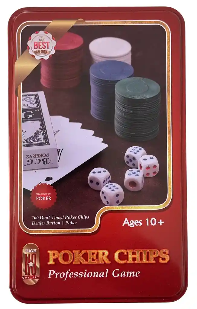 SET JUEGO DE POKER CHIPS PROFESIONAL/ Metálica Perfectos tanto para principiantes como para expertos, estos juegos de cartas te guiarán a través de las reglas y te ayudarán a desarrollar tácticas ganadoras. Transforma tus noches de juego con el Set de Poker Tipo Casino. Este completo set incluye 24 fichas rojas, 24 fichas amarillas, 24 fichas azules, 24 fichas negras, 1 ficha Dealer, 5 Dados, 1 Baraja de naipes de 54 cartas, 1 Caja metálica de lujo, para que lleves tu pasión por el póker a donde quieras. Con este set, no solo tendrás todo lo necesario para jugar, sino que también podrás aprender las manos básicas del juego de cartas y su clasificación. Fichas y cartas diseñadas para resistir el uso constante. La caja metálica garantiza que todo esté en su lugar. Ideal para noches de amigos, familiares o torneos. No dejes pasar la oportunidad de tener el Set de Poker Tipo Casino y disfruta de emocionantes partidas en la comodidad de tu hogar o donde desees. Haz tu compra hoy y lleva tu experiencia de juego al siguiente nivel. CARACTERÍSTICAS: - Marca: POKER CHIPS. - Accesorios incluidos: Baraja + fichas + Dados + Caja Metálica. - Material: Polietileno. - Medidas Empaque Metálico: 19cm x 11.5cm x 5cm DISTRIBUIDOR AUTORIZADO Envíos a nivel nacional. ONE ZONE SPORT NIT: 901.451.888-6