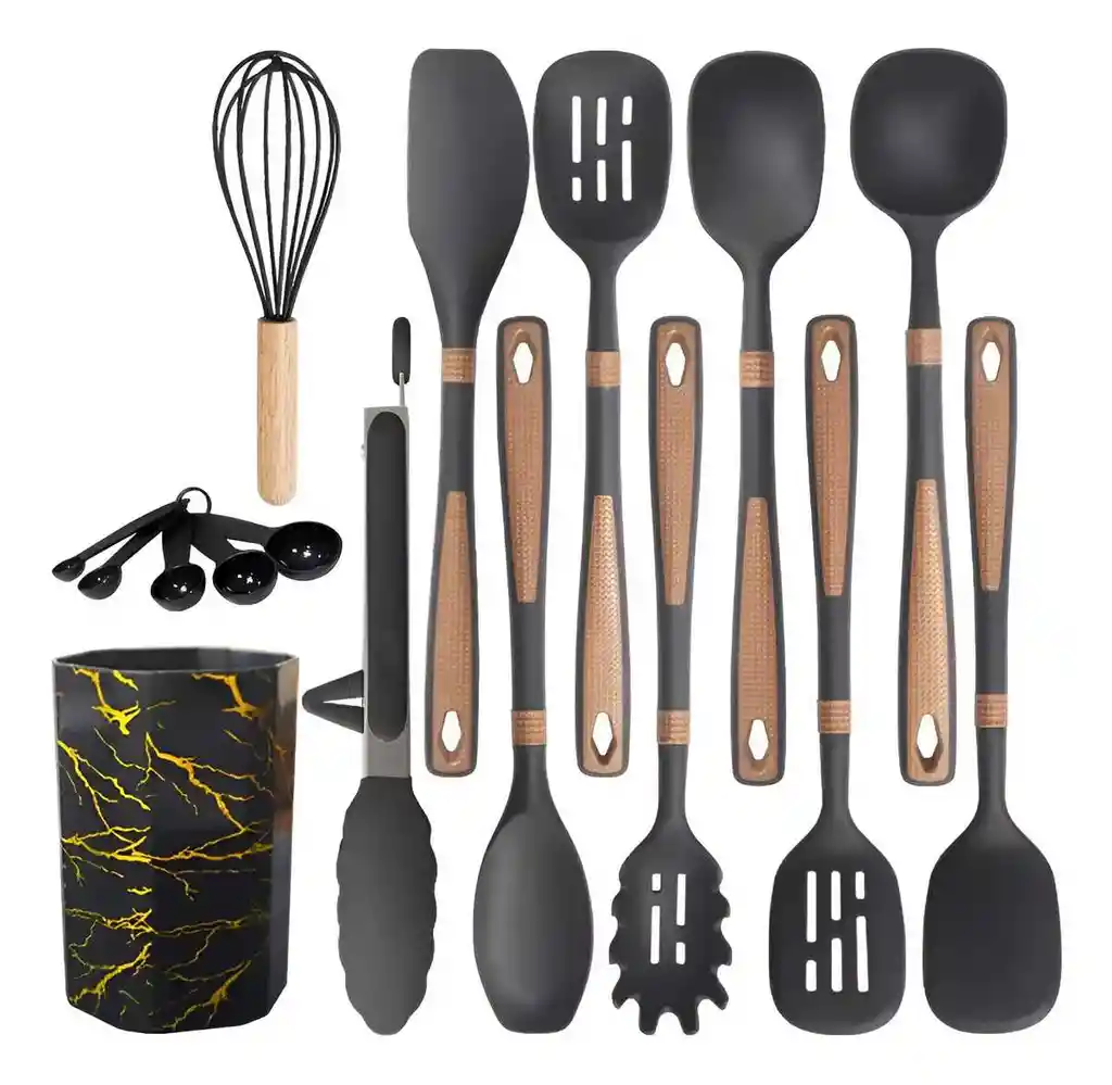 Este set de utensilios de cocina de 14 piezas es la solución definitiva para equipar tu hogar con elegancia, durabilidad y máxima protección para tus ollas y sartenes, gracias a su fabricación en silicona de grado alimenticio de alta resistencia térmica. Diseñados para soportar altas temperaturas sin derretirse ni desprender sustancias tóxicas, estos utensilios cuentan con mangos ergonómicos con un sofisticado acabado texturizado que garantiza un agarre seguro y cómodo durante el oficio diario. El juego incluye un kit completo de espátulas, cucharones, batidor, pinzas y cucharas medidoras, además de un elegante recipiente organizador con diseño marmoleado que ahorra espacio y aporta un toque de lujo a tu cocina. Su superficie antiadherente facilita una limpieza impecable en segundos, convirtiéndose en el aliado indispensable para cualquier chef aficionado o profesional que busca cuidar su menaje mientras prepara las mejores recetas con total practicidad. FICHA TÉCNICA Producto: Set de Utensilios de Cocina Profesional Cantidad total: 14 Piezas (Incluye soporte y medidores) Material de la punta: Silicona de grado alimenticio (Libre de BPA) Material del mango: Polímero térmico reforzado con textura antideslizante Resistencia térmica: Hasta 230°C Uso recomendado: Superficies antiadherentes, granito, cerámica y acero Características: No raya las ollas, fácil lavado, orificio para colgar, larga durabilidad Garantía: 1 mes por defectos de fábrica POLÍTICA DE GARANTÍA Y RETRACTO Este set cuenta con 1 mes de garantía únicamente por defectos de fabricación (como desprendimiento de piezas o fallas en el material al recibirlo); no aplica garantía por quemaduras por fuego directo, cortes con cuchillos o decoloración por uso de químicos abrasivos. Dispone de máximo 5 días para reportar novedades (piezas faltantes o daños de transporte). Para cualquier devolución por retracto, el producto debe entregarse en su empaque original en perfecto estado y sin señales de haber sido utilizado en contacto con alimentos por razones de higiene.