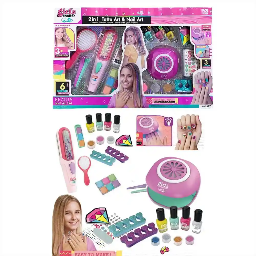 Deja que tu hija se divierta disfrutando de este espectacular kit. Este increíble gel de uñas y pinta cabello está diseñado para alentar y promover la creatividad de las niñas mientras disfrutan de un tiempo de diversión. No es tóxico, muy fácil de manejar y diseñar. Dibuje y pinte looks duraderos con esmalte como profesional. Es fácil crear diseños de uñas fabulosos con color en apliques, solo pelar, pegar y rellenar con los bolígrafos. Este es un regalo perfecto para cualquier niña de 5 años +, para cumpleaños, Navidad, o cualquier otra ocasión. Contenido: - 3 esmaltes para uñas - 1 maquina secadora de uñas - stickers para las uñas - 2 separador de uñas de pies - 3 brillos de uñas tipo escarcha - 1 cepillo para el cabello - 2 palas para rellenar dispositivo de tintura para el cabello - 1 dispositivo de tintura para el cabello ( tiene forma de plancha, este dispositivo se rellena con las tinturas para cabello incluidas para que al pasarlo por el cabello como una plancha haga los rallitos de color ) - 6 tinturas de cabello de diferetes colores Medidas del producto : 46x30x 8 cm Fácil de operar y diseñar ¡Crea un aspecto genial! ¡Diseña tus uñas! y Cabello