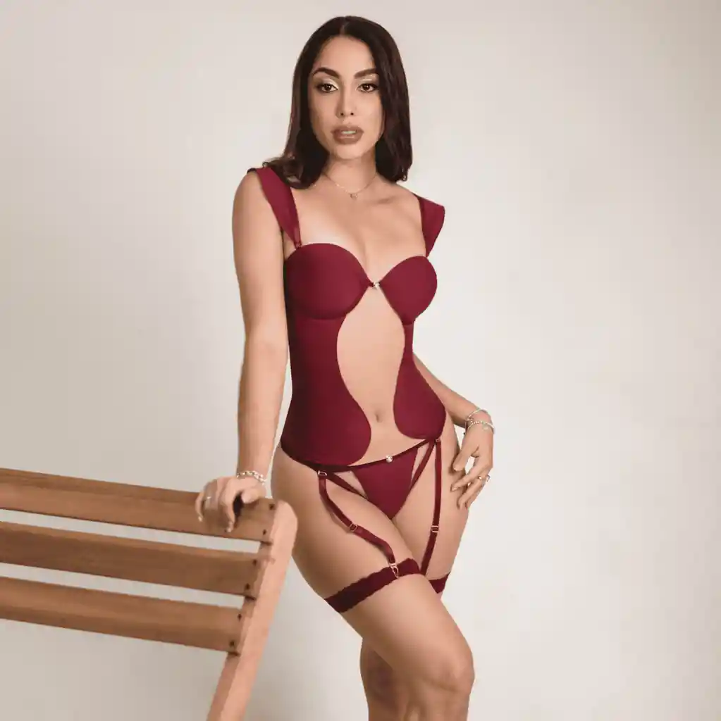 Set Kara vino talla L. Incluye brasier talla 36 con copas de realce, panty talla L, y ligas ajustables.