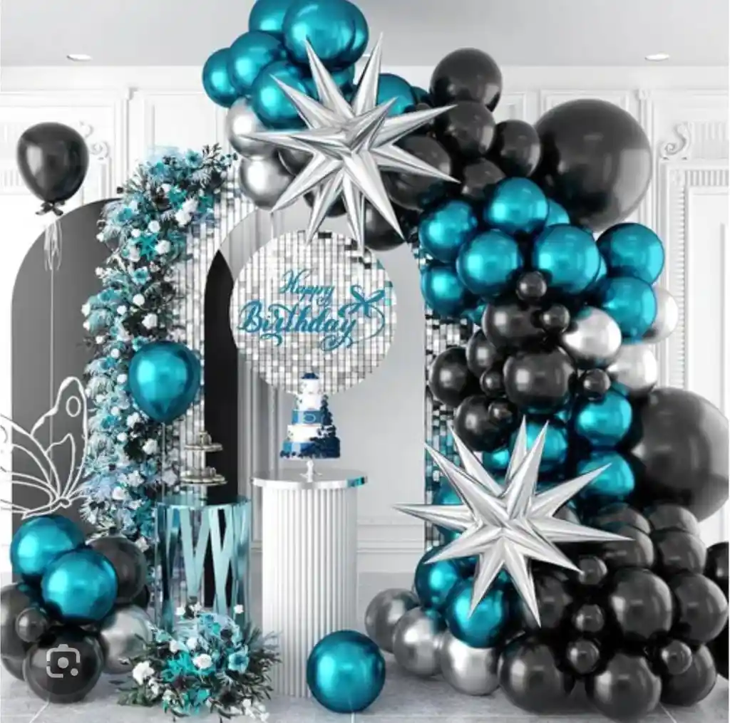 Set Kit Bouquet Kit Decorativo Cumpleaños De Color Azul Y Negro Metalizado 72 Pcs